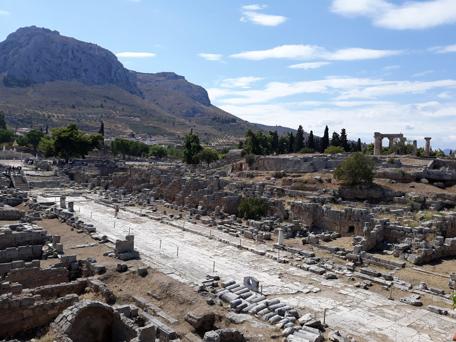 The archaeological site of Ancient Corinth is located 90 km west of Athens and contains “Peirene Fountain“, “Temple of Apollo” (6th c. BC with 1st c. AD restorations) “Bema of St Paul” Roman Forum, “Odeon“, “Amphitheater“, “Glauke Fountain“.